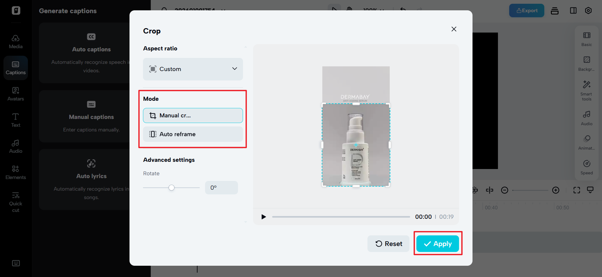 Select Smart Tools and go to Auto Reframe. Select your Aspect Ratio and select Manual Crop or Auto Reframe, and select Apply. The frame is cropped effectively to get rid of watermarks or any other text.