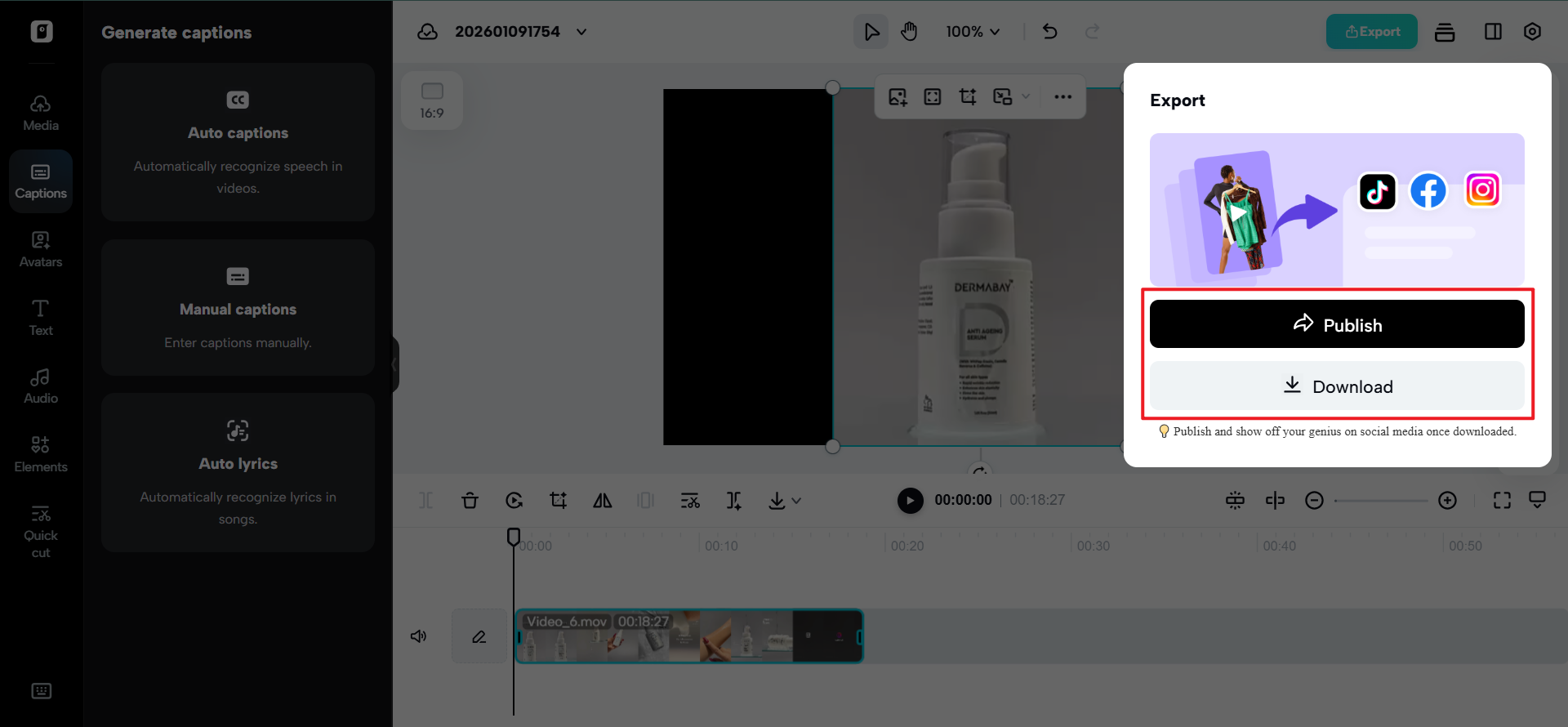 Click “Export” in the top right corner and select “Publish” or “Download.” You can then configure your settings for exporting and click Export once more to either save it to your computer or send it directly to social platforms.